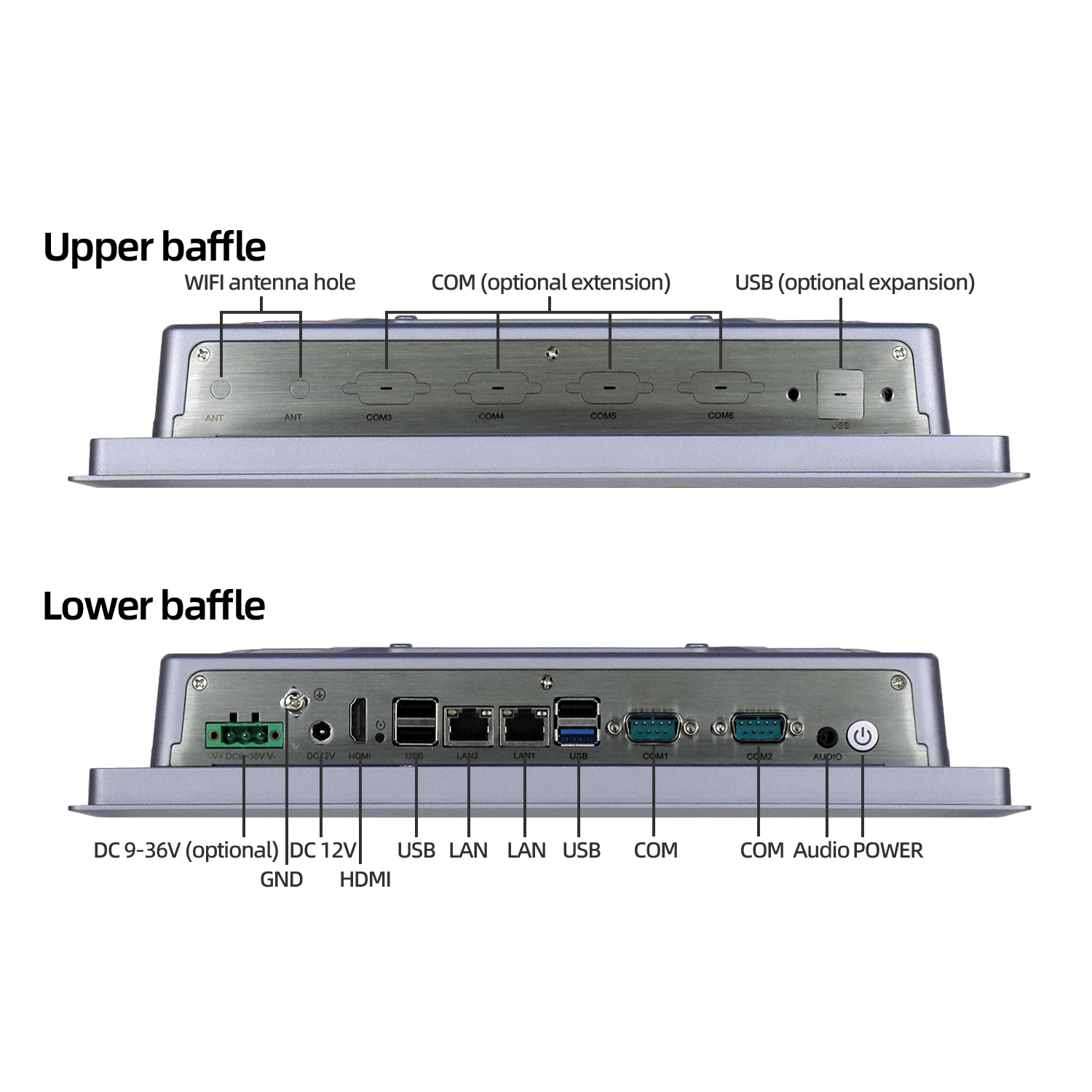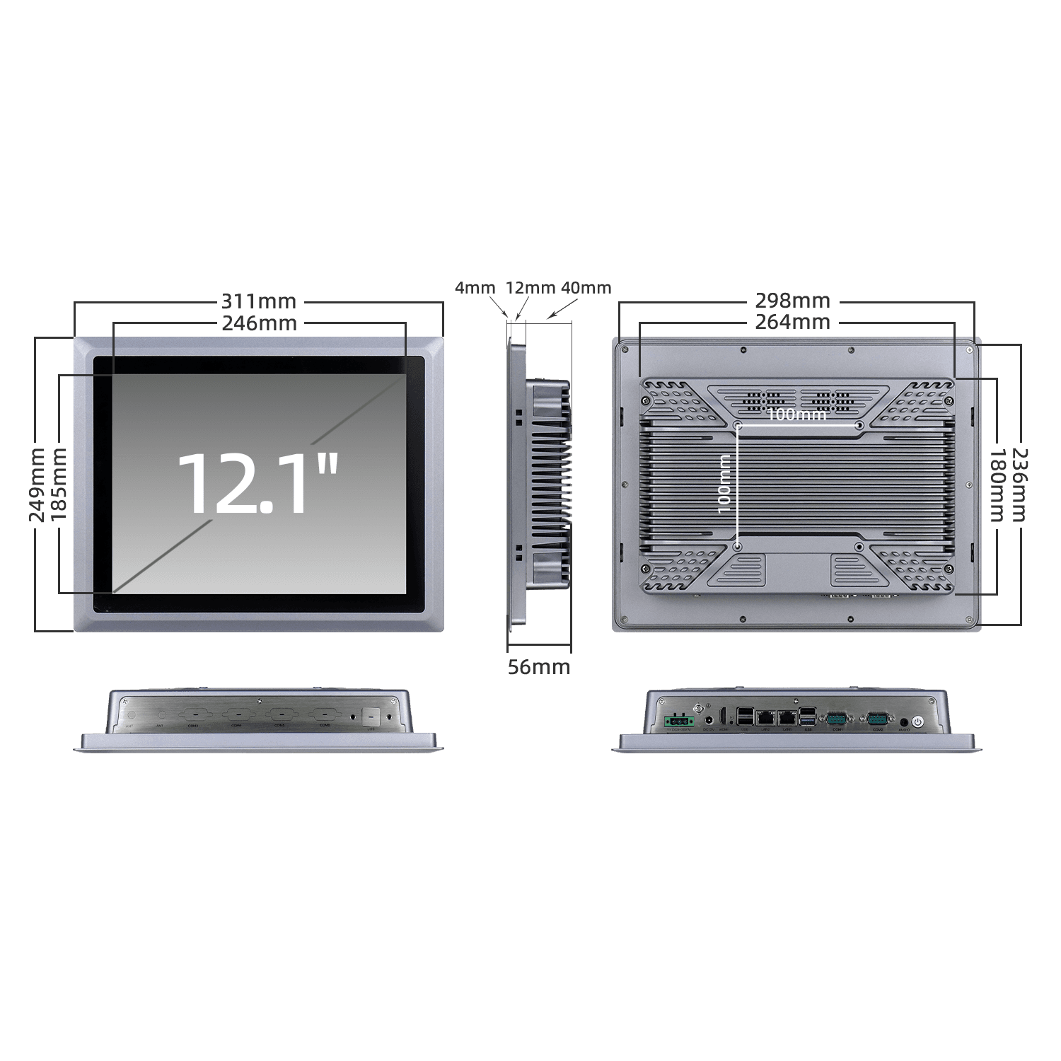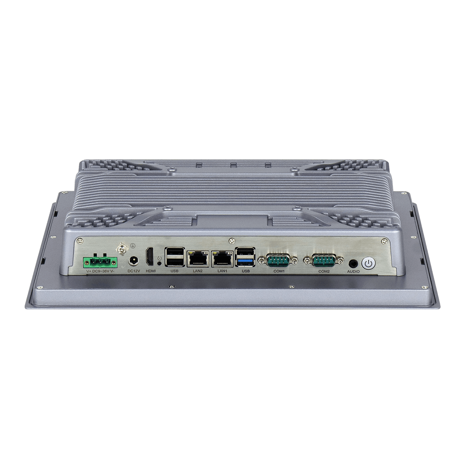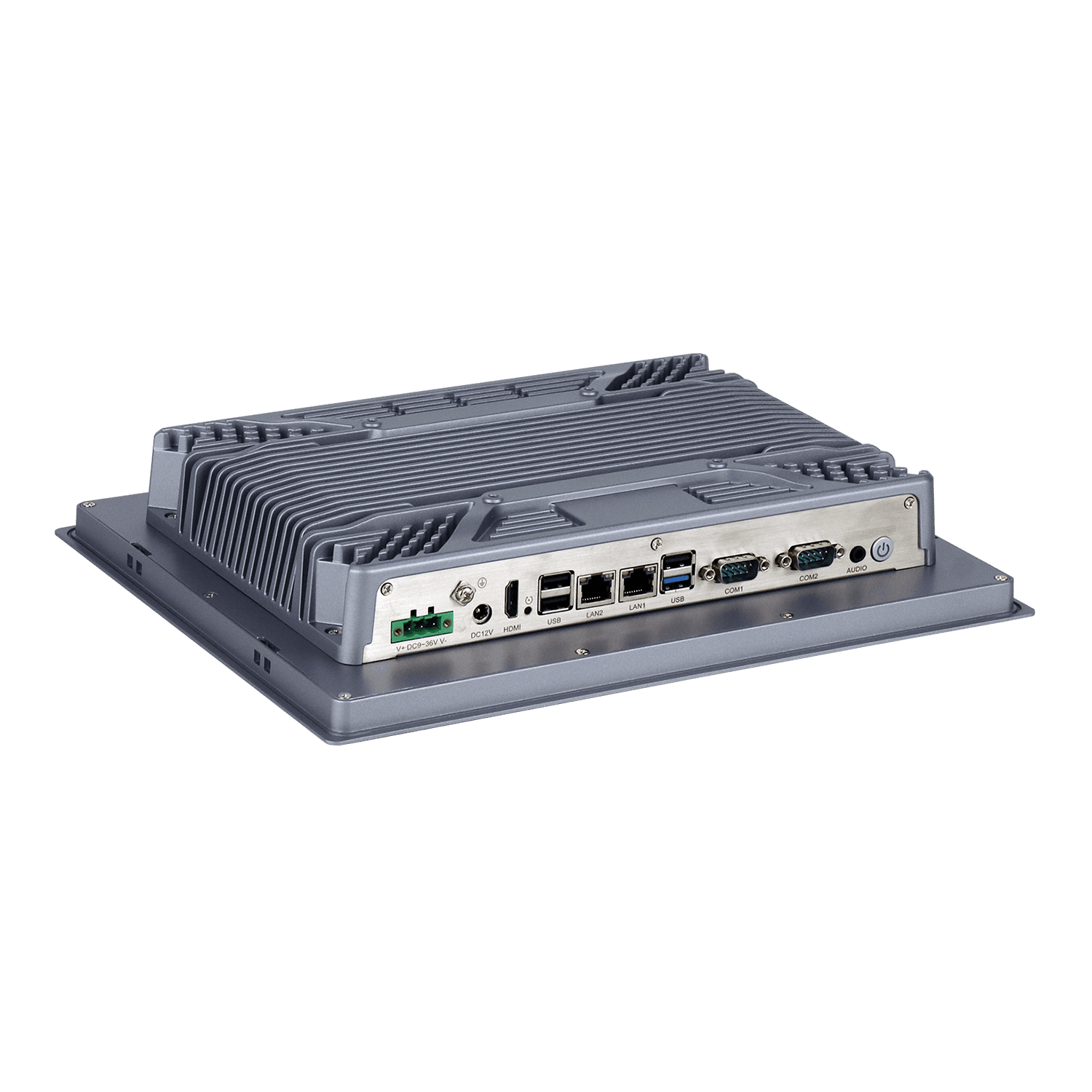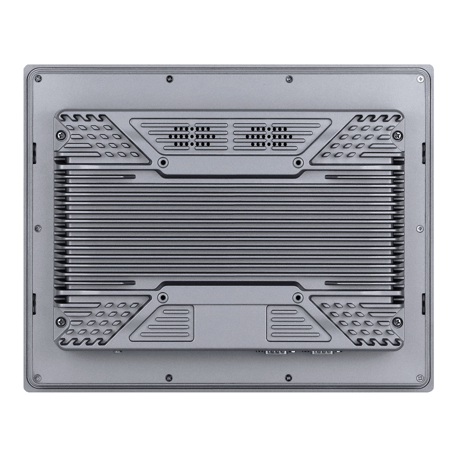 无风扇 嵌入式 强固型 工业平板电脑 支持宽温环境(-20°C至60°C),全封闭铝鳍无风扇的设计,保障更高效散热和强固防振性,使其成为更可靠的工业平台,提供安全接地部件更有效保护设备。屏幕12.1英寸LED背光工业屏,铝合金前面板符合IP65防水标准,可选全平面电容触摸屏或电阻触摸屏。