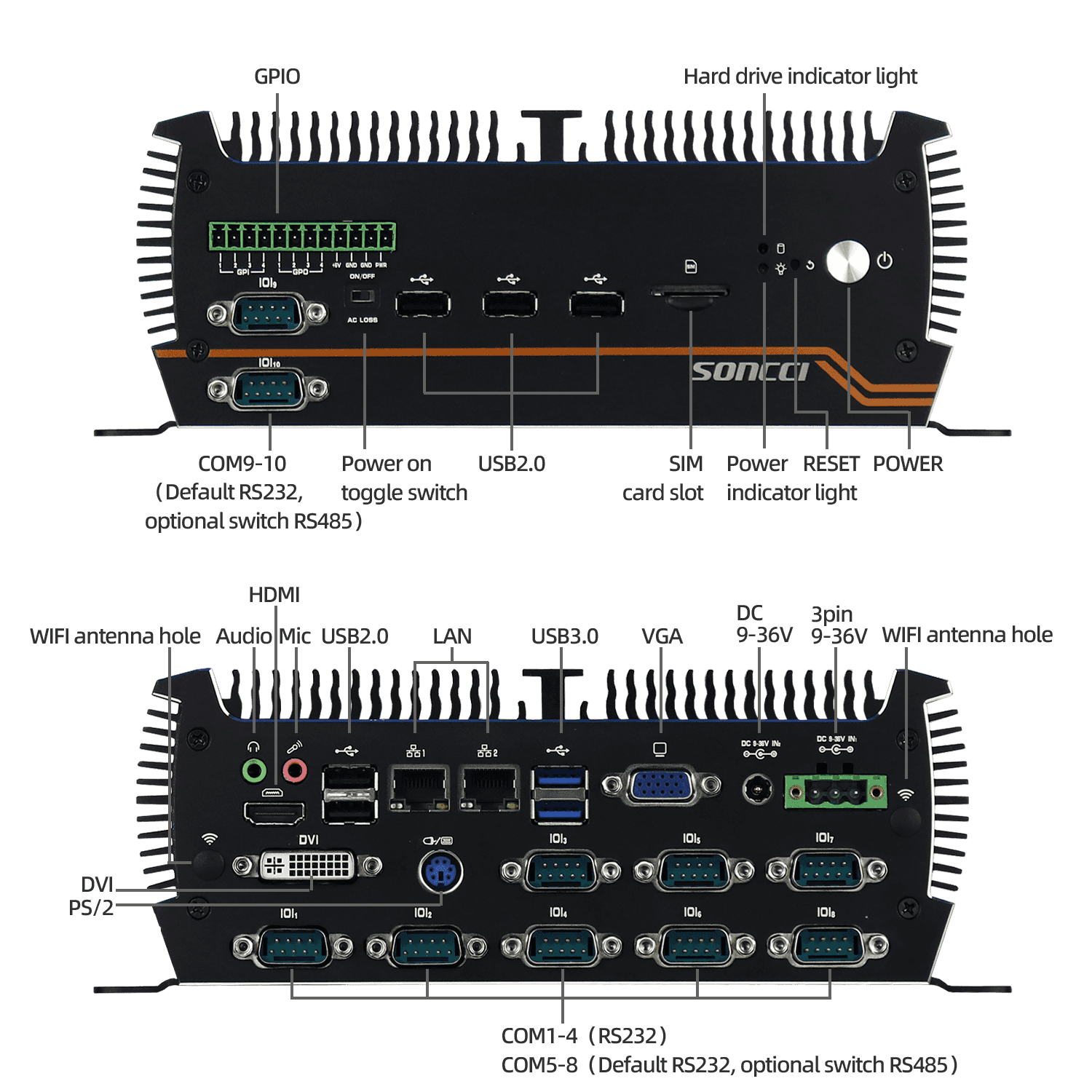SCI-S5010C10 10串口 GPIO 宽压 三显示 嵌入式工控机 搭载intel Celeron/Core处理器,支持DDR3/4内存,并在2.5寸SATA、mSATA、M.2存储提供多种选择。它配备了丰富的接口和按键,有LAN、COM RS232/485、USB、GPIO、上电开机拨钮开关、SIM卡槽、HDMI+VGA+DVI三显示等,支持从9-36V宽电压范围直流输入,可扩展WIFI/蓝牙/4G模块,支持Windows和Linux系统。